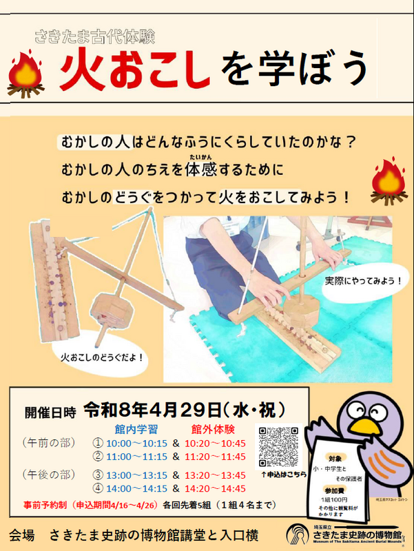 4月29日(水・祝)、古代体験「火おこしを学ぼう」を開催します。