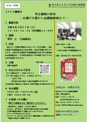 令和8年3月21日(土)に、さきたま講座⑤「考古遺物の保存-水漬け木器から金錯銘鉄剣まで-」を開催します。
