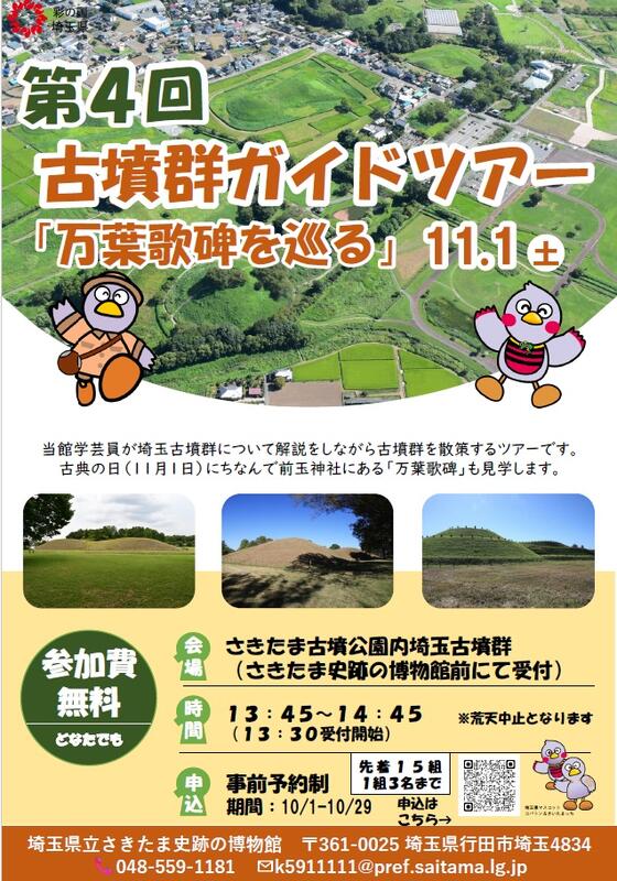 11月1日(土)に、埼玉古墳群ガイドツアーを実施いたします。今回は11月1日の「古典の日」にちなんで前玉神社 にある「埼玉の津」と書かれた「万葉歌碑」も見学します。